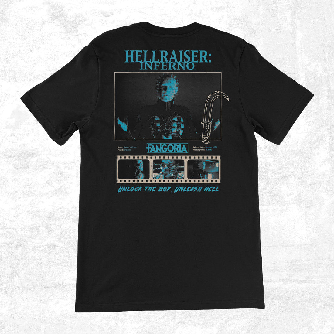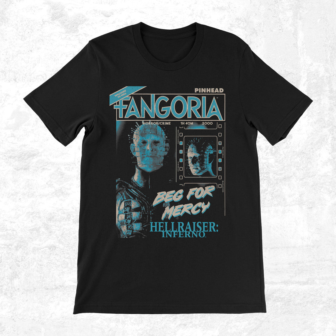 Welcome back to Hell. Rep your favorite Hellraiser character in style with this officially licensed, exclusive Pinhead T Shirt by Fangoria! Made with 100% cotton, striking ice blue accents, and a hangtag with a matching collectible sticker, this iconic tee will have begging for mercy.